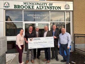The Municipality of Brooke-Alvinston was awarded $19,400 from the Judith & Norman Alix Foundation to provide resurfacing to the Inwood Community Park Basketball Court. Mayor Ferguson stated that “We are pleased to receive support from the Alix Foundation to beautify our community and upgrade the space for our residents to enjoy” Pictured here are Warden Marriott, a member of the Judith & Norman Alix Foundation and Mayor Ferguson.